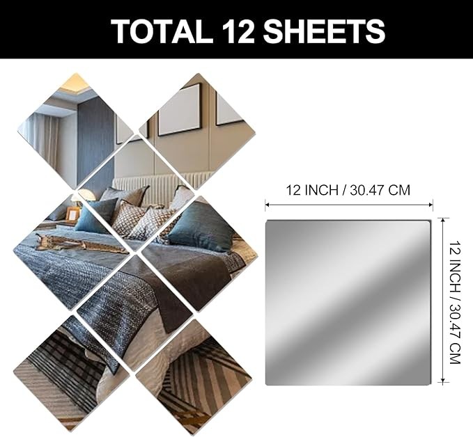 12" x 12" Acrylic Flexible Mirror Sheets, 12 Pack Self Adhesive Mirror Tiles Square Cuttable Mirror Wall Stickers, Non-Glass Mirror Stickers Safety Reflective Mirror for DIY Craft Home Wall Decor