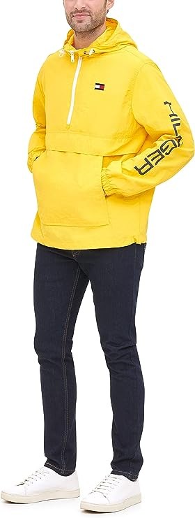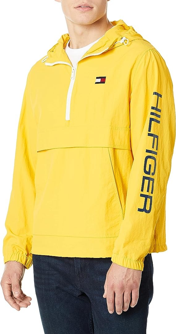 Retro half zip hooded popover jacket in a lightweight taslan nylon with a half zip center front closure, drawstring hood and waistband, elastic cuffs, zipper vent detail on right side seam, Hilfiger logo screen-print down left sleeve, classic tommy flag logo embroidery on left chest and one lower center patch pocket with dual side entry.