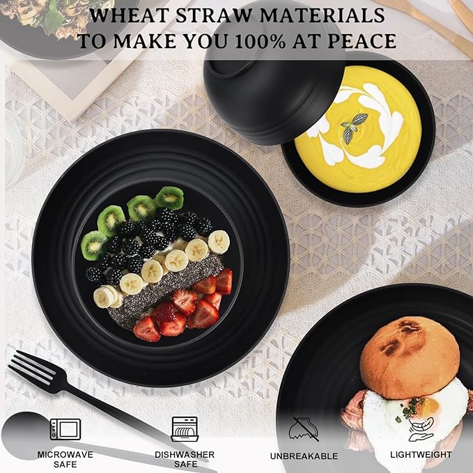 28-Piece Wheat Straw Dinnerware Sets, Microwave & Dishwasher Safe Unbreakable Dinnerware Set, Reusable Dishware Sets, Lightweight Camping Dishes, Plates, Cups, Cereal Bowls for 4(Black) Visit the PYRM