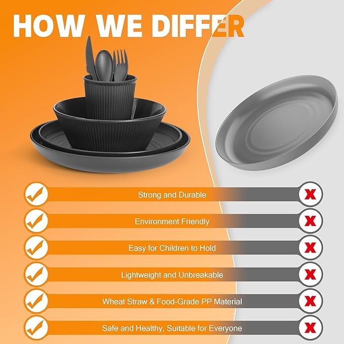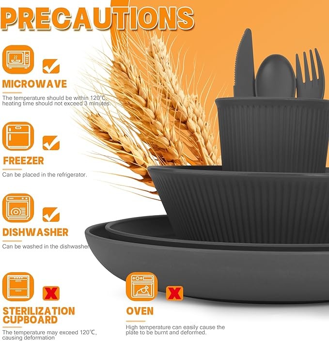 ? MULTI-PURPOSE DINNERWARE: OAMCEG dinnerware sets are made for every occasion, that's why it’s a perfect choice for daily use at home kitchen , BBQs, picnics, camping trips, dorms, schools or offices. Make your meals more colorful and appetizing with premium quality wheat straw dishes!