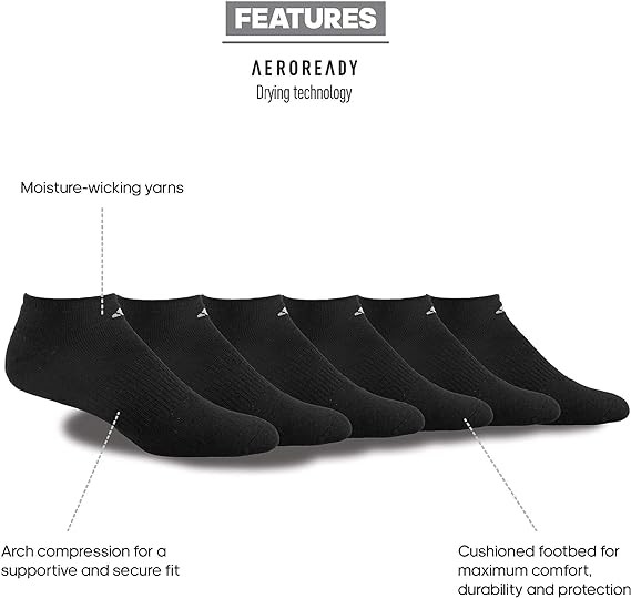• Moisture-wicking yarns keep feet dry from sweat.