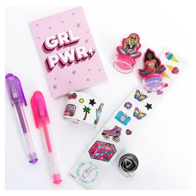 Includes an activity journal, 2 gel pens, 2 mini Barbie character stampers and 3 sticker rolls.