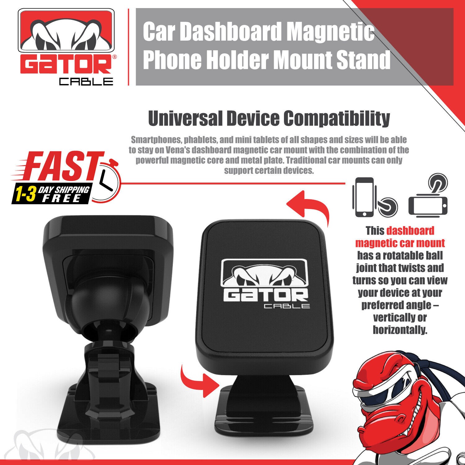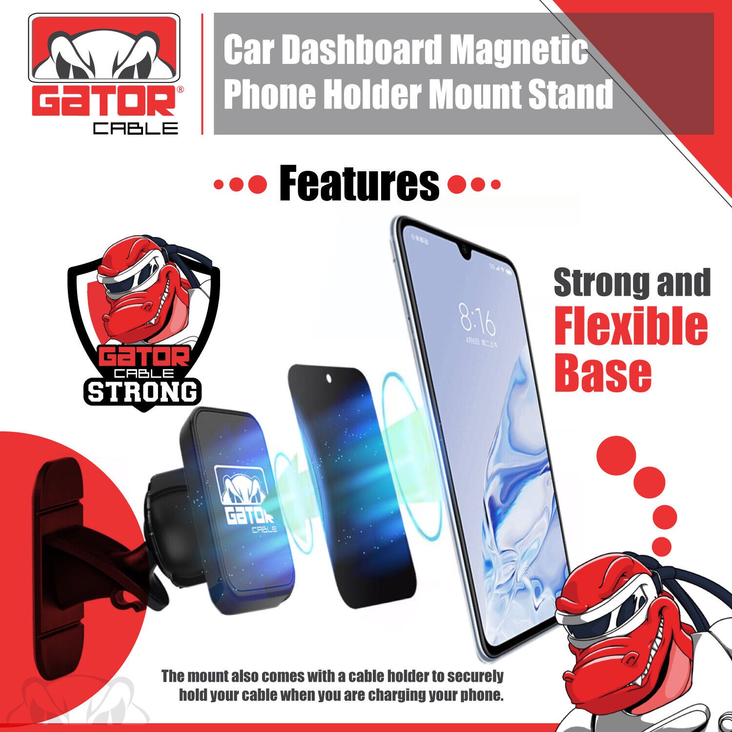 2 Metal Plates Included, Powerful Magnetic Core, Strong and Sturdy Base Mount, Adjustable Angle