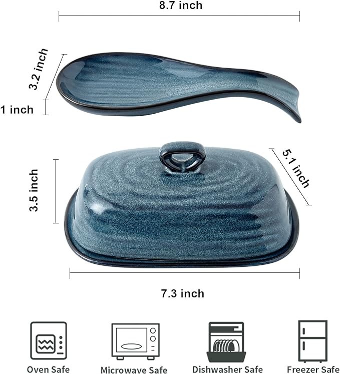 • VERSATILE AND EXQUISITE DESIGN: The spoon rest and butter dish is designed with blue reactive glaze which can add a modern touch to your home. And the spoon rest can use to place kitchen utensils, such as fork, knife, spatula, ladle and tong. You can use the butter dish to keep your butter fresh.