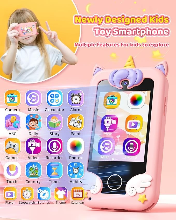 Kids Toy Smartphone, Gifts and Toys for Girls Boys Ages 3-8 Years Old, Fake Play Unicorn Toy Phone with Music Player Dual Camera Puzzle Games Touchscreen, Birthday, Kids Trip Activity