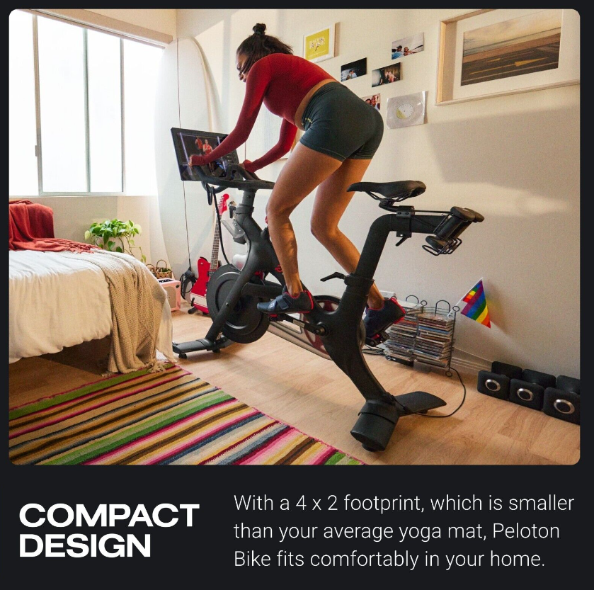 Small-space friendly - Peloton Bike has a compact, 4' x 2' footprint, and an adjustable seat, handlebar, and screen, which tilts to accommodate different heights. This stationary bike fits comfortably in your home whether you're low on square footage or working around furniture.