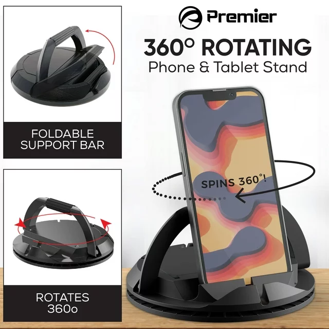 Premier 360° Spin Stand Universal Rotating Phone and Tablet Stand for Home, Office, Black