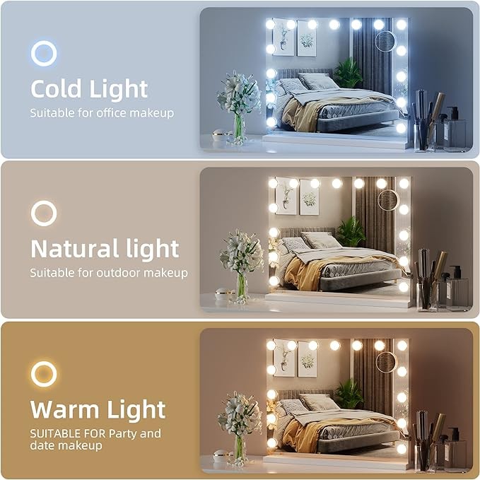 • ??Smart vanity mirror with Touch Sensors✨✨: Simply touch turn on/off sensor to light up make up mirror, and change the 3 color modes( warm/natural/cool) by touch “M” sensor, Dimmable brightness from 10-100% by touch “P” accordance with you need while applying makeup. Also the smart makeup mirror with Intelligent light memory function, it will keep the state of your last use