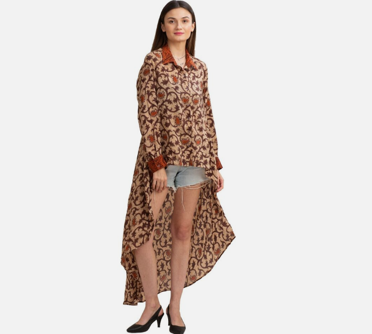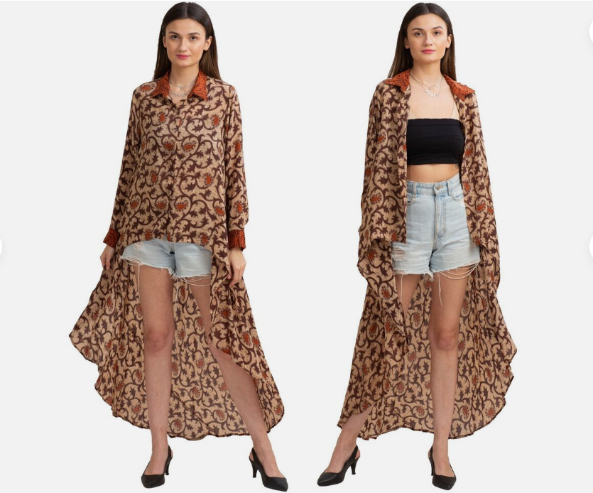 3: This outfit has been upcycled from a vintage silk saree, sourced from Sanskriti Vintage's own store. Fabric used: Printed Pure Crepe Silk