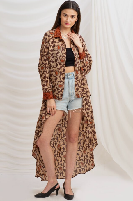 This upcycled shirtdress is a versatile and sustainable piece of clothing. It has been given a new life from repurposed materials and transformed into a chic and fashionable dress. The high low hemline adds a trendy touch, making it perfect for any occasion. The shirtdress style is timeless and classic, with a button-up front and collar. By choosing an upcycled shirtdress like this, you're not only reducing waste but also making a unique and eco-friendly fashion choice.